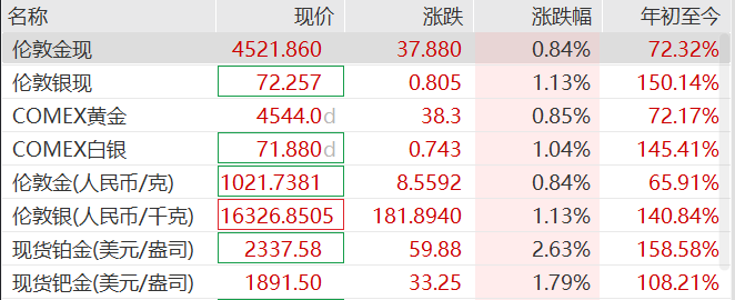 12月24日,现货黄金首次升破4520 美元/盎司,截至9:27,日内涨0.84%。今年累计上涨近1900美元。纽约期金涨0.85%,盘中向上触及4550美元/盎司。现货白银日内涨幅扩大至1.13%,首次站上72美元/盎司关口,年初至今涨幅超150%。