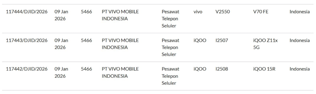【CNMO科技消息】1月9日,据外媒报道,iQOO和vivo旗下多款未发布新机在全球多个认证机构中密集现身,预示着新一轮产品发布潮即将到来。型号为I2508的iQOO 15R在相继通过蓝牙SIG认证后,又获得了印度尼西亚电信监管机构SDPPI的批准。与此同时,同一认证平台的文件显示,型号为I2507的iQOO Z11x 5G以及型号为V2550的vivo V70 FE也一同获得了入网许可。
