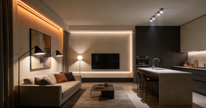避坑方案:采用“基础照明(主灯/筒灯)+重点照明(射灯/轨道灯)+装饰照明(灯带/壁灯/落地灯)”的组合。厨房操作台、卫生间镜前、衣柜内部、展示柜内,记得增设专用光源。