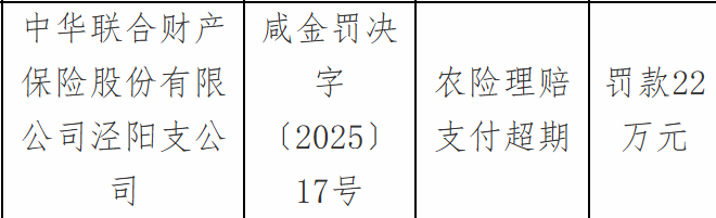1月14日,国家金融监督管理总局咸阳监管分局行政处罚信息公示表显示,中华联合财产保险股份有限公司泾阳支公司因农险理赔支付超期被罚款22万元。