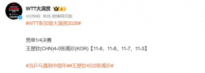 在这场WTT新加坡大满贯赛男单1/4决赛中,王楚钦用一场4:0,给出了答案。