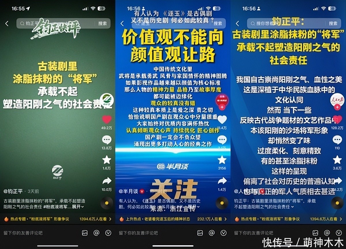 自从钧正平下场点评“粉底液将军”之后,更多官媒也下场发声点评,抵制这种审美。但粉丝似乎还在硬撑,想用《逐玉》是古偶剧来说事,再度遭到官媒回怼,“价值观不能向颜值观让路”。