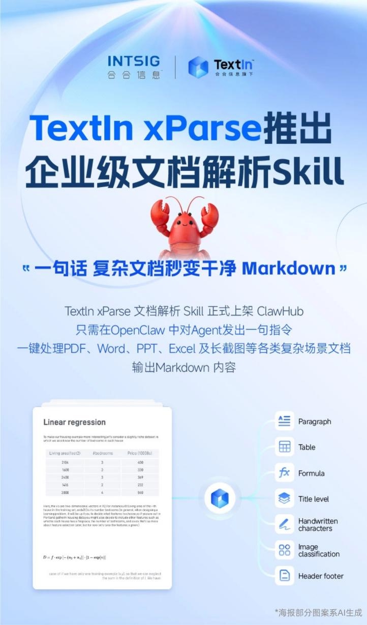 随着大模型走向“自主执行”阶段,以“龙虾”(代指“OpenClaw”)为代表的智能体应用受到了AI行业的广泛关注。作为智能体调用外部专业能力的标准化接口,Skill成为智能体搭建中的关键要素。但在企业真实业务场景中,Skill落地面临核心挑战。文档解析能力不足,导致大量Skill难以在工作流程中稳定运行。近日,合合信息旗下TextIn推出文档解析Skill,将企业级文档解析能力,首次以标准化Skill形态面向开发者免费开放,帮助智能体高效处理复杂文档。